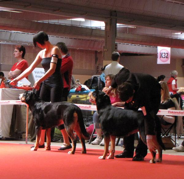 V nedeljo nas je čakala svetovna razstava. Prijavljenih je bilo 58 švicarjev. Naj priznam, da sem jih pričakovala nekoliko več. Zjutraj smo se tja pripeljali, kot da se na sejmišču sploh nič ne dogaja (kar je bilo za nas kar presenečenje, glede na to da smo navadno za vstop na parkirišča na takih razstavah čakali tudi po 2 uri v kolonah). Nobene gneče, dovolj parkirnih prostorov, veliki ringi in okrog ogromno prostora za gledalce. Izjemna ponudba vseh pripomočkov za pse... Kar žalostni smo bili, da je bil naš kombi tako poln in si nismo mogli privoščiti večjih nakupov. Tako lepo organizirane razstave v svoji razstavljalski karieri še nisem doživela.