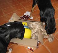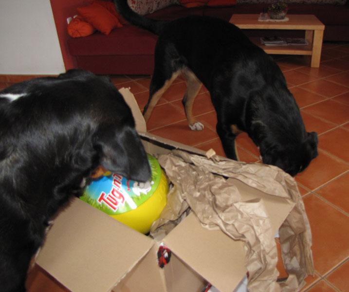Kmalu se je prikazala bogata vsebina, Divo pa je bolj kot ta zanimal papir, ki je obdajal darilo. Ni je bilo večje zabave kot vlečenje papirja iz škatle ter cufanje in metanje v zrak le-tega... Kmalu pa je zraven pristopila tudi Nuba in si ogledala če je v škatli kaj zanimivega zanjo. Njej se s papirjem ni dalo ubadati... |
