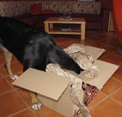 Hitro se je zopet "zakopla" v škatlo in že odkrila novo dobroto. Priboljške-tokrat na srečo pasje... |