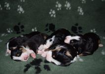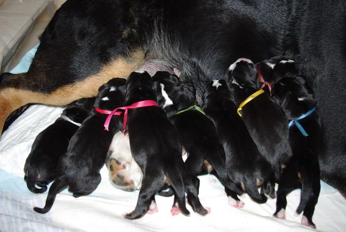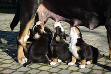 | 24.11.2008 je Nuba skotila 9 čudovitih mladičkov-5 samčkov in 4 samičke. Porod je trajal le 6 ur in je potekal povsem brez zapletov. Nuba je zopet dokazala, da je odlična mama. Za mladiče je zelo lepo skrbela ter jih naučila prvih "švicarskih posebnosti", npr. ležanja na hrbtu, kako se po damsko prekrižajo tačke ko počivaš, kako je treba "pofehtati" za slasten priboljšek in podobno. Mladiči so bili zelo izenačeni po teži in vsi pravilno obarvani. Prav vsi so se ponovno skotili brez zadnjih slednikov, kar je odlično, saj nam jih ni bilo potrebno odstranjevat. Karakterno so bili ponovno krasni - izredno stabilni in zelo odprti do ljudi. Upamo, da bodo v ponos novim lastnikom in seveda tudi nam! |
