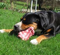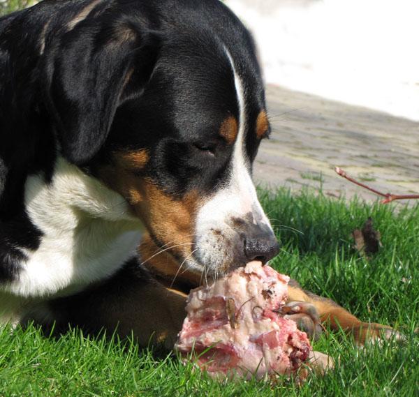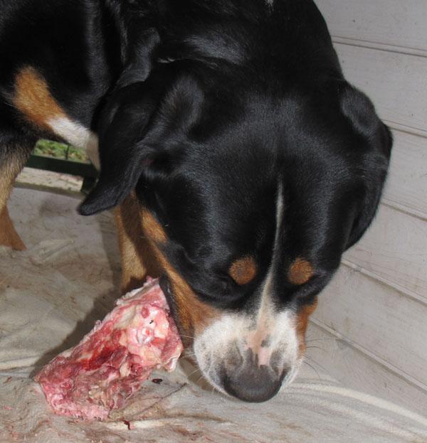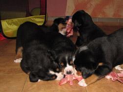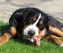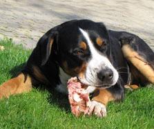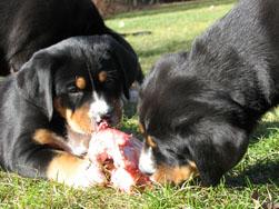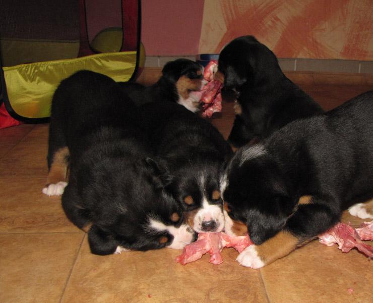 Večkrat dobim na e-mail vprašanja glede prehrane švicarjev, zato sem se odločila napisati kratek prispevek o prehrani svojih psov in tudi mladičev vzrejenih pri nas. Predvsem zato, ker prehrana naših psov ni tipična, ampak že več kot 10 let prisegamo na naravno, večinoma surovo hrano, ki jo tudi sami pripravljamo. V Sloveniji smo bili eni prvih vzrediteljev, ki smo s takin načinom prehrane začeli in lahko rečem, da imamo na tem področju bogate izkušnje. Morda bo prispevek komu v pomoč pri sestavljanju novih jedilnikov, morda se bo kdo zamislil nad načinom hranjenja svojih psov in morda se nekateri tudi ne boste strinjali z njim. Nikakor ni moj namen komu česarkoli vsiljevati, predstavlja le moj pogled in moje dosedanje izkušnje na tem področju. Mi smo zelo zadovoljni!