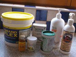 - dodatke (MSM, glukozamin, hondroitin, omega 3 maščobne kisline, pivski kvas, vit. C, vit. E)-prillagajamo in dodajamo po potrebi