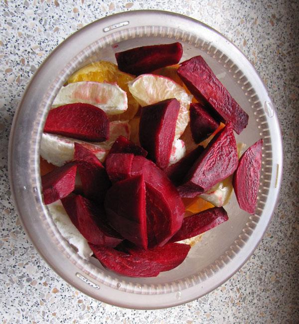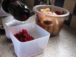 Predpriprava sadja in zelenjave v sokovniku - zmes se hrani vedno dodaja surova. |