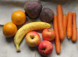 - zelenjavo-sezonsko z domačega vrta (peso, korenje, brokoli, peteršilj, cvetačo, zelje, bučke, špinačo, por, blitvo,...); zelenjavo spasiramo v sokovniku ali naribamo, včasih tudi skuhamo